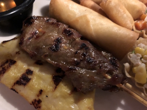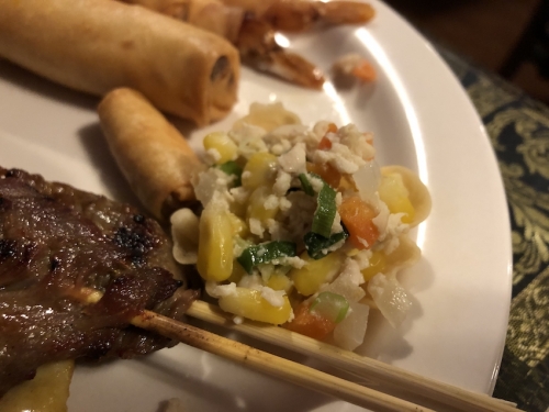 タイハウスレストランの特別メニューで、前菜盛り合わせです。サテ/Sate(東南アジアの串焼き)、春巻き、エビフライなどが含まれています。