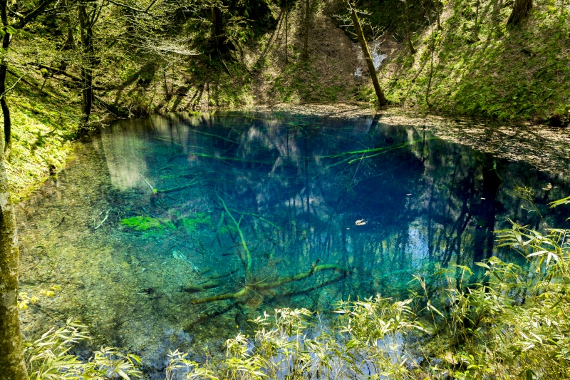 ブナの自然林をぬけると、沸壺の池が広がります。青池に匹敵する透明度を誇る湖です。この池では、1日520tにもなる豊富な湧水が湧き出ており、「沸壺池の清水(わきつぼいけのみず)」として環境省の「平成の名水百選」にも選定されています。