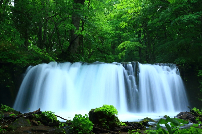 奥入瀬渓流で唯一本流にかかる銚子大滝。高さ7m幅20mにも及ぶ、圧倒的な水量のダイナミックな滝がご覧になれます。