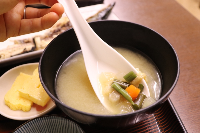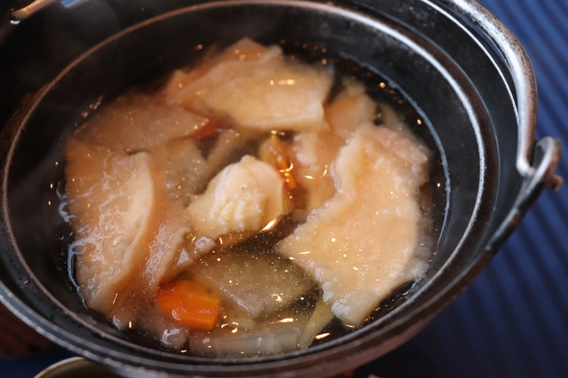 大根、人参、山菜、凍り豆腐、油揚げなどをすべて細かく刻んで煮込んだ汁物です。味付けは味噌で行います。