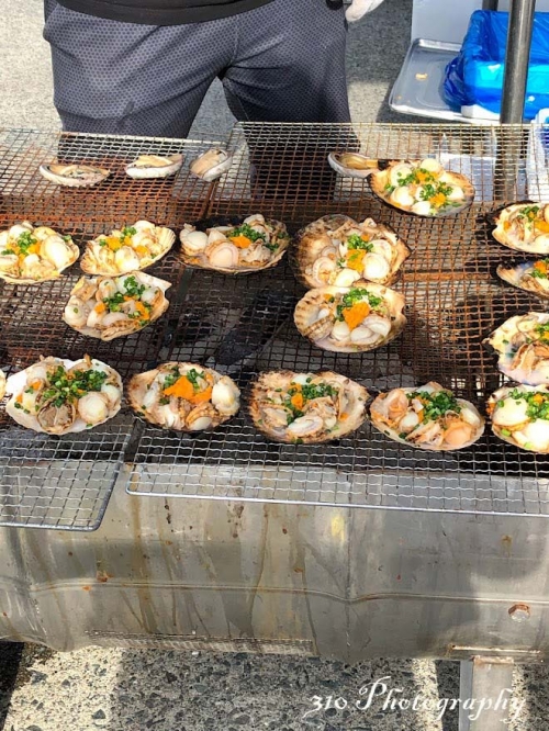 岸壁には、全長約800m、およそ300店の巨大朝市が出現。人気店ではオープン前から行列ができ、5時、6時には売り切れてしまうメニューも少なくありません。ピークは7時頃ですが、5時頃には駐車場は満車状態になってしまうようですので、お目当てがある方はくれぐれも注意してください。