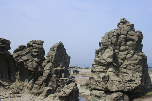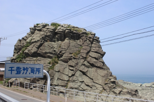 千畳敷海岸は、1792年の地震により隆起した岩床の海岸。その昔、この形状を珍しがった津軽藩の殿様が千畳の畳を敷いて宴会をしたことからこの名が付いたと言われています。広がる岩棚とにょきにょき生える奇岩が面白い景観。殿様が宴会を開きたくなったのも頷けます。