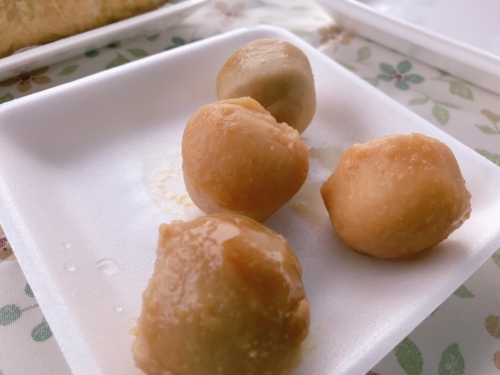 今回いただいたのは、「里芋の煮物 4ヶ(100円)」と「ねぎ入りだし巻き玉子(250円)」です。柔らかく煮込まれた里芋はしっかり味が染みていて美味しく、ネギ入りの卵焼きはダシがしっかりきいたこれぞおふくろの味と呼べる一品でした!!