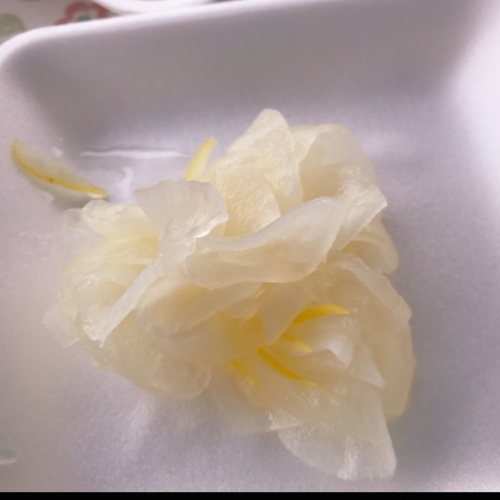 そのほか、イートインスペースのテーブルの上には、マカロニサラダやレモンと大根が入った漬物が置かれていて、どちらも無料で提供されていました。なんとも豪快なサービスで、地元の方が訪れるのも納得です!!