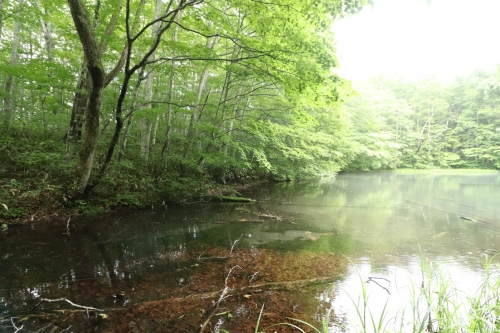 水深が浅く秘密基地のような場所で、神秘的な雰囲気がただよっています。透明感あふれる水のなかにはイワナが生息しています。