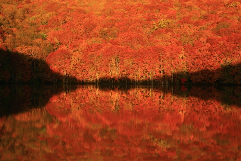 蔦七沼は一年を通じて楽しめる場所ですが、見どころは蔦沼でみられる秋の朝焼け。早朝、真っ赤に色付いた木々たちが朝日に照らし出される様は、一見の価値あり。大自然が生んだ鏡張りの絶景をご覧になってみてはいかがでしょうか。紅葉のピークは10月中旬から下旬頃。