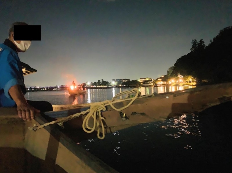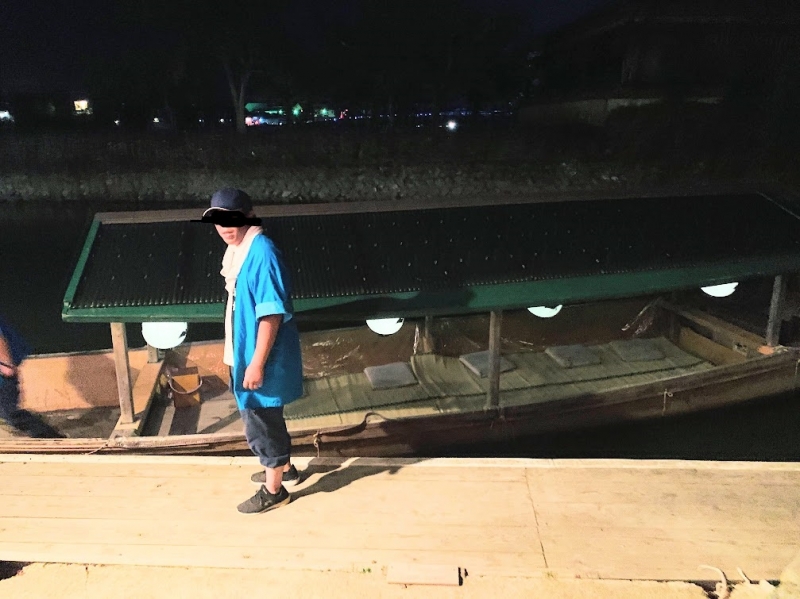 それでは、いざ出発です。渡月橋を背にして、川の上流へ向かっていきます。昼間は非常に暑い嵐山でも、夜になると気温が低くなり、夜風もあたってとても心地よいです。