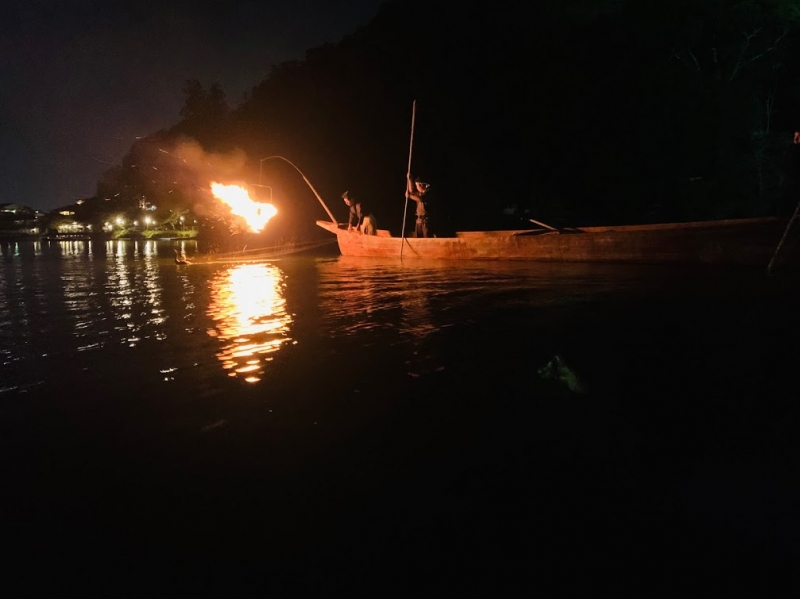 そして上流へ到着すると、待ちに待った鵜飼見学のスタートです。写真のようにいくつかの屋形船をひもで繋げ、屋形船が一直線に並びます。