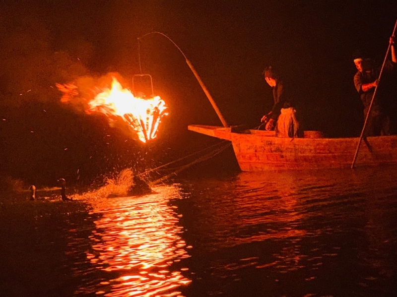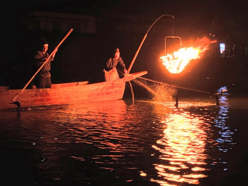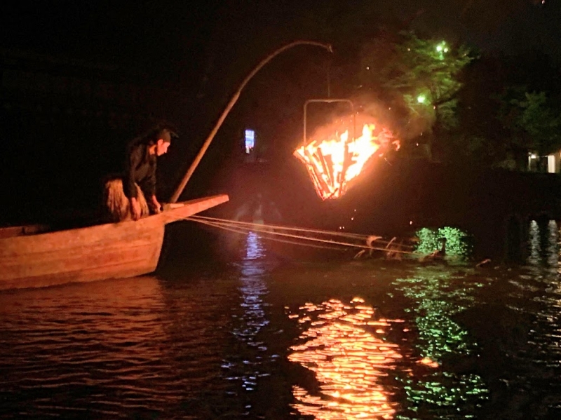 鵜匠さんが、かがり火を灯し、その火に驚いた鮎などの川魚の動きが活発になります。その活発になった川魚を海鵜が捕まえるのです。