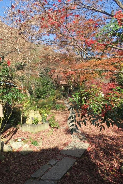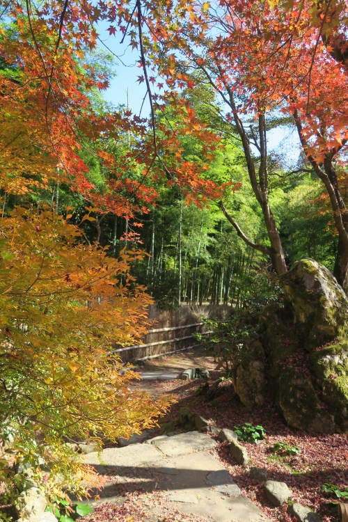 竹林に囲まれた寺院は隠れた紅葉の名所で、紅葉の時期でもゆったりと見事なお庭を楽しむことができます。特に青々とした竹林と紅葉の朱色のコントラストが素晴らしいです。