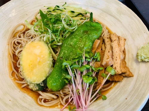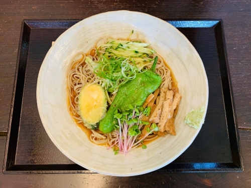 ズッキーニの天ぷらや、九条ねぎ、トウガラシなどの野菜がたっぷり入っており、これら新鮮な京野菜は、手打ちそばとの相性も抜群です。