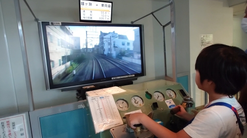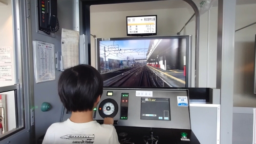 東武日光線をスクリーンの風景を楽しみながら、マスコンハンドルを握った疑似運転体験ができます。