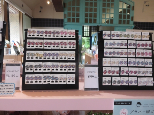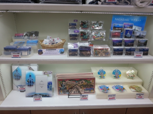 人気ナンバーワンは下写真左側のグラバーさんのチーズケーキ(小:756円/大:1,080円)だそうで、他にも色々なマグネット(440円~660円)や長崎ガラス(イヤリング、ドロップピアス:各1,100円など)など見とれてしまう商品も沢山。