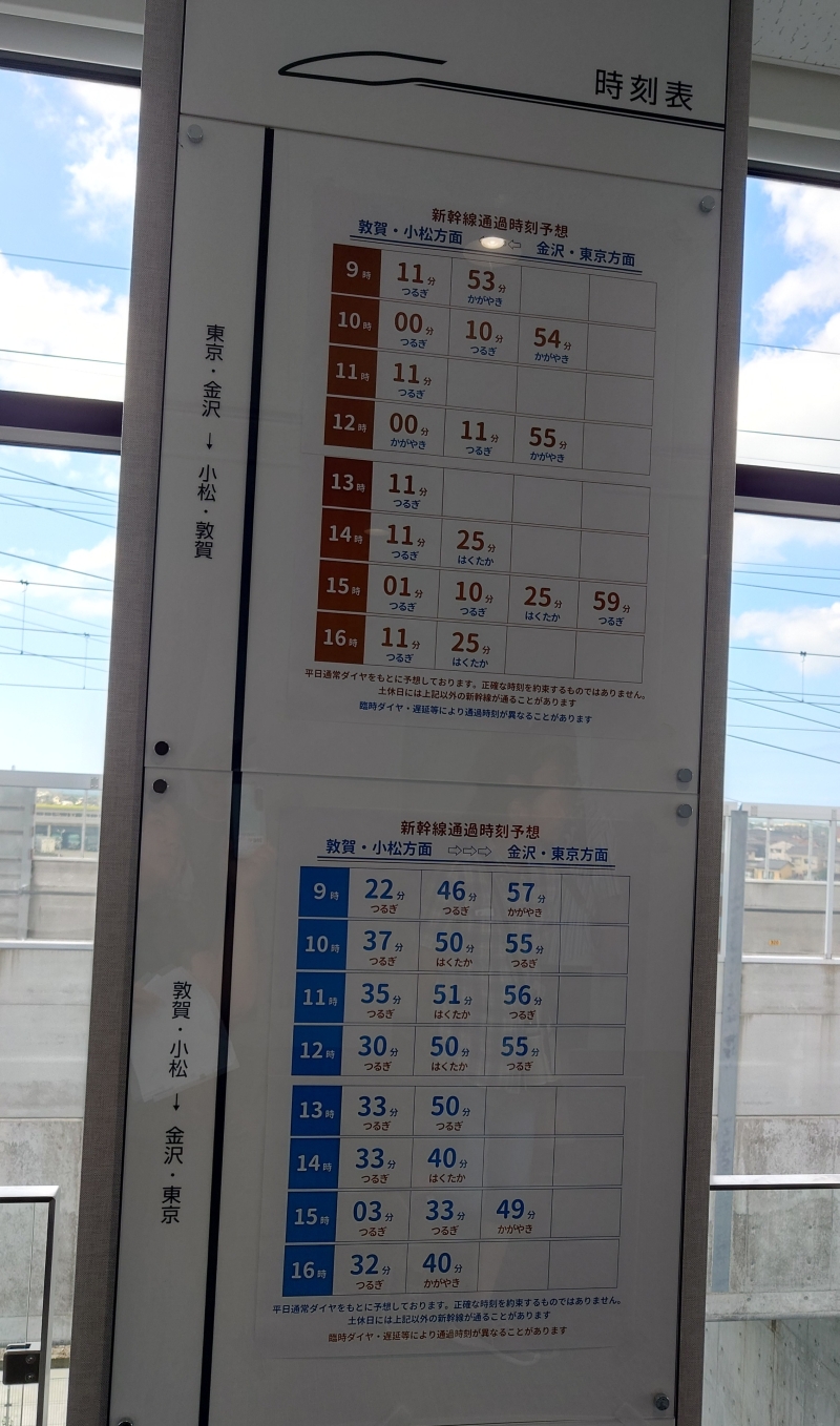 館内には、北陸新幹線が通過する時刻表が掲載されているので、最初にチェックしてください。