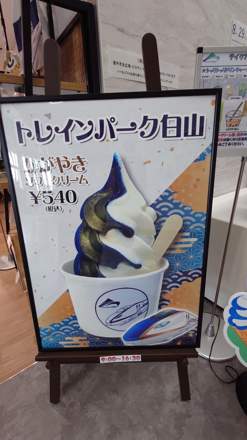 1階のお土産コーナーでは、トレインパーク白山限定の、鮮やかなブルーが映えるジューシーなかがやきソフトクリーム(税込590円)が大人気です。