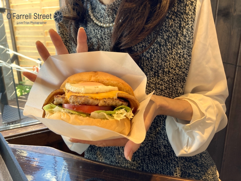 ウエスタン調の建物も、テラス席も広い駐車場もアメリカをイメージしているようです。店内に入ると牛肉の焼ける香ばしい匂いが漂っています。表面がトーストされたバンズから、はみ出す厚切りのベーコンソテーとジューシーなパティ、シャキシャキレタスもバーガーの本場アメリカを彷彿とさせるHEROバーガー(¥1,150)。