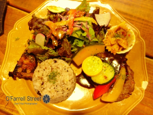 ランチメニューには、プレートランチ(¥1,250)やカレーハンバーグ、ピザなどの他、チーズタッカルビ(¥1,320)など珍しいメニューも並びます。湯川米や会津産コシヒカリを使用したヘルシーな五穀米に、オーガニック野菜をたっぷり使用したランチメニューは、見た目もおいしさも最高です。