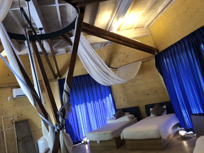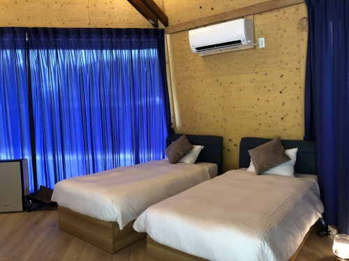 BBQができる部屋の隣にあるテントが寝室です。全室ベッド4台があり、とっても広々。