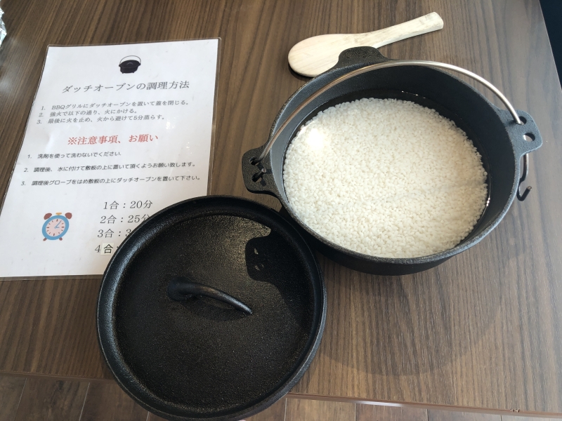 予約サイトでは各種オプションがつけられるのですが、ダッチオーブンで炊くごはん はいかがでしょう?!兵庫県はお米の産地としても有名なので、地元のお米をいただけますし、ダッチオーブンとはBBQらしさが楽しめてワクワクします🎵 1合330円からで、BBQガスコンロにかけて炊きます。
