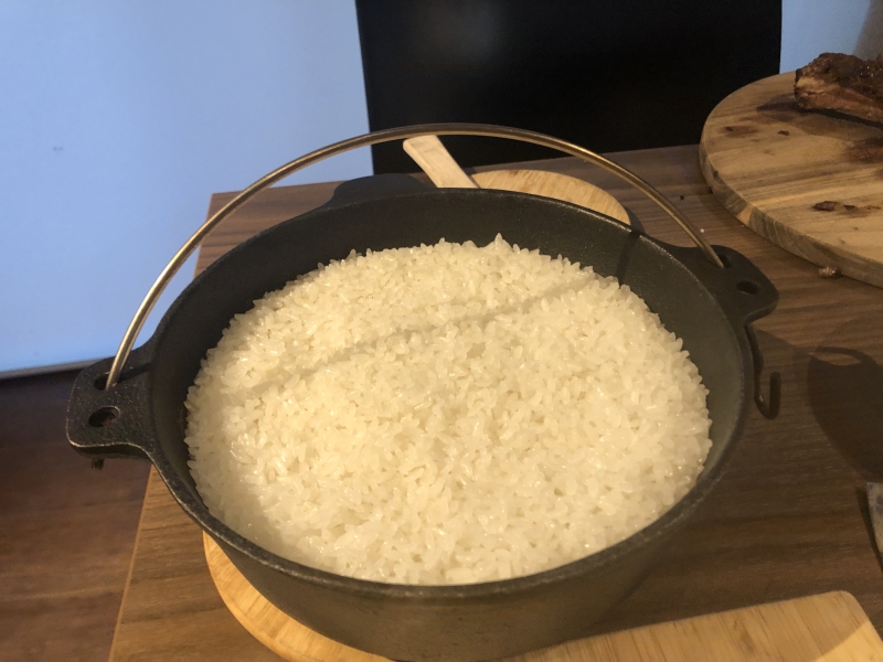 炊き上がりのほかほか白ごはん、またダッチオーブンの底にあるおこげが、また堪らなく美味しいです。
