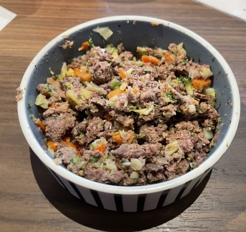 上の写真は小型犬用の100g。人間が見ても美味しそうです。このままあげると、せっかくのバーグを丸呑みしてしまいそうなので、細かくして、野菜と混ぜてあげるのも良いかもしれません。