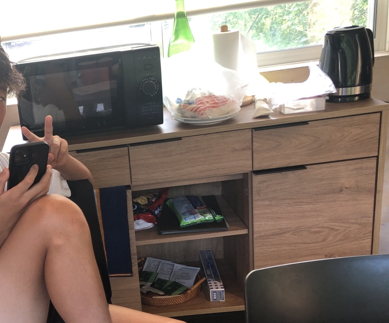 また、ベッドにあげるのは不安というワンちゃんのために、ゲージもあります。ペットシート、トイレトレー、餌皿、コロコロ、消臭スプレー、犬用ウェットティッシュなど、ワンちゃんと一緒のステイに役に立つ備品も一通り揃っていて、ありがたいです。