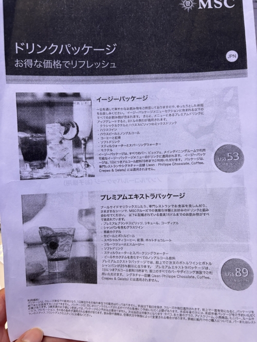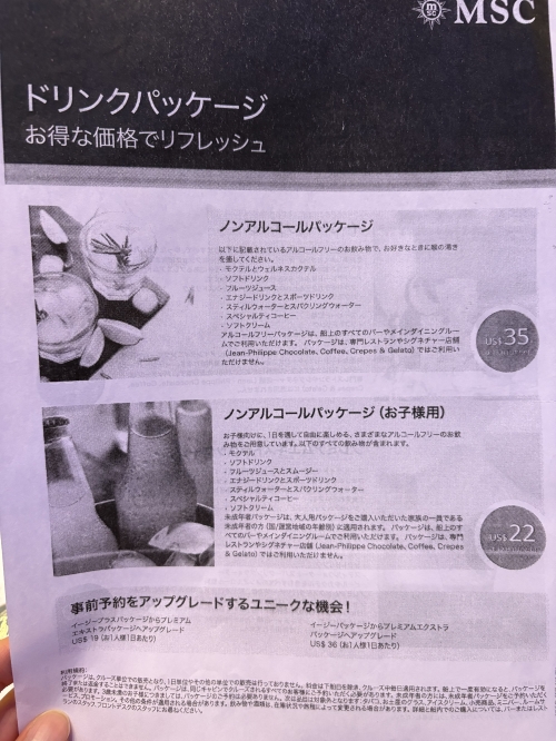 ドリンクパッケージはイージーパッケージに加入しましたが、おかげで終日どこでも気軽にジュースやアルコールを楽しむことができ、加入してよかったです。