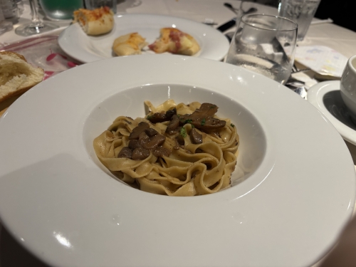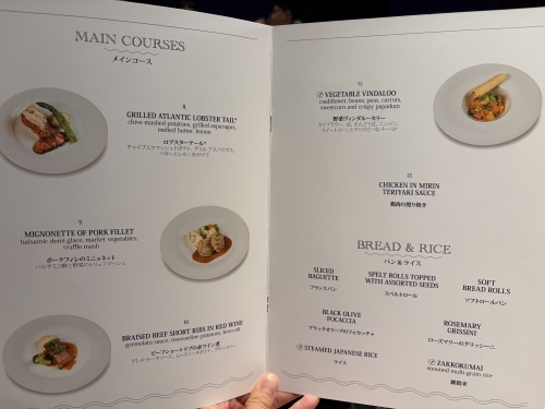 ドレスアップの指定があるディナーの日は、他の日よりも少し豪華にロブスターや牛の赤ワイン煮のようなメニューもありました。