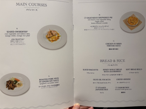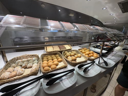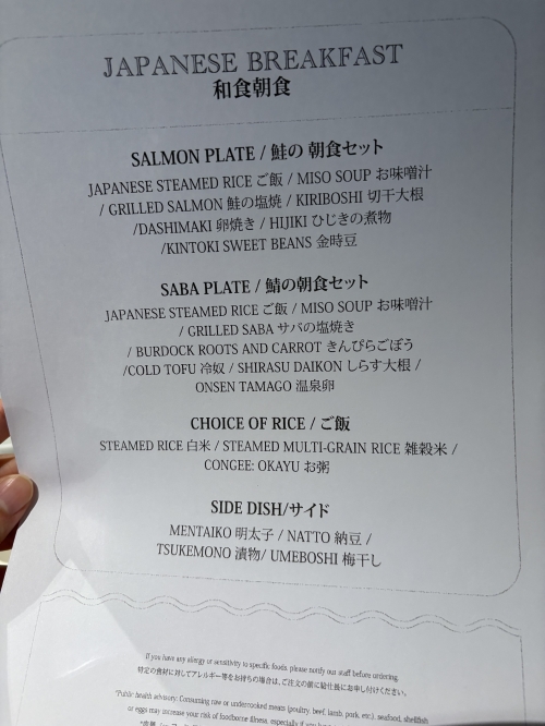 朝食は毎日同じメニューでした。何を何個頼んでもOKなので、和定食とオムレツ、ワッフルと納豆ごはんのように好きなものを好きなだけいただけます。なお、ミニペストリー、ジュース、コーヒー・ホットミルクはサーバーの方がまわってきてくれます。(このジュース、コーヒー・ミルクはドリンクパッケージ未加入も無料です)