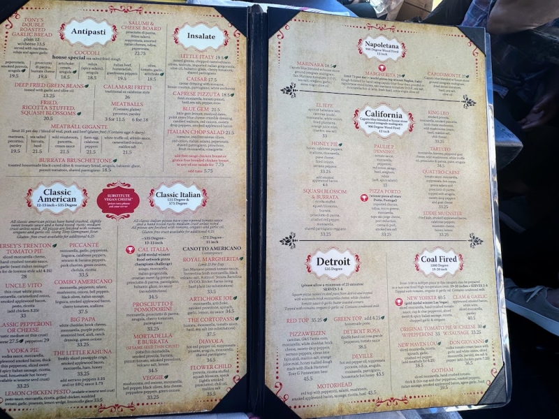 メニューは昔ながらのバインダー形式で、ナポリ風・ニューヨーク風・デトロイト風など、多彩なピザスタイルから選べるのが大きな特徴。