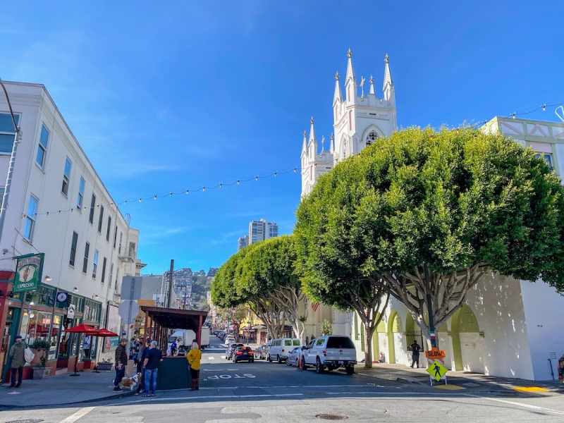 ストックトン通りとユニオン通りが交わる角にあり、交差点にはイタリア国旗のカラーが彩られたペイントが施されています。周囲にはイタリアンレストランやカフェが立ち並び、街全体が陽気で活気にあふれています。