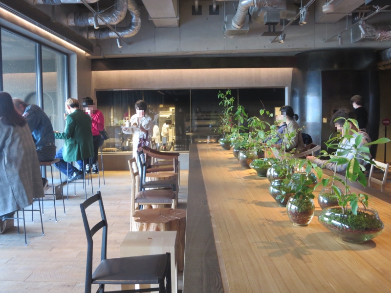 カフェからは併設の工房で作られる商品が出来上がる様子が眺められ(写真奥)、大きな窓からは琵琶湖が見られます(写真左手側)。