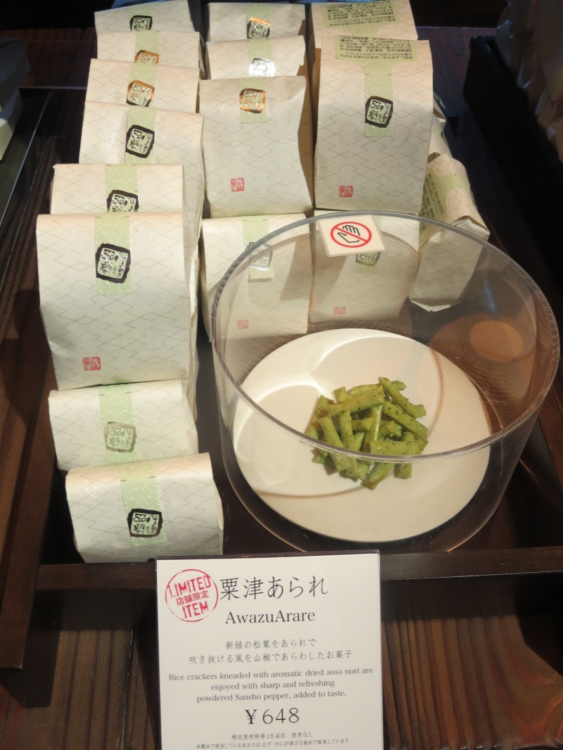 新緑の松葉をあられで、吹き抜ける風を山椒であらわしたあられです。店舗限定です。