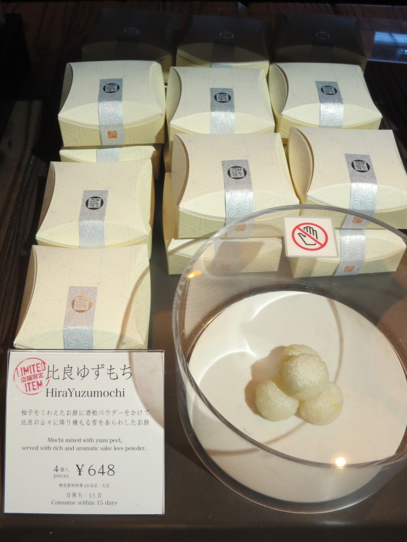 柚子を加えた餅に酒粕パウダーをかけて比良の山々と降り積もる雪をあらわしたそう。店舗限定です。