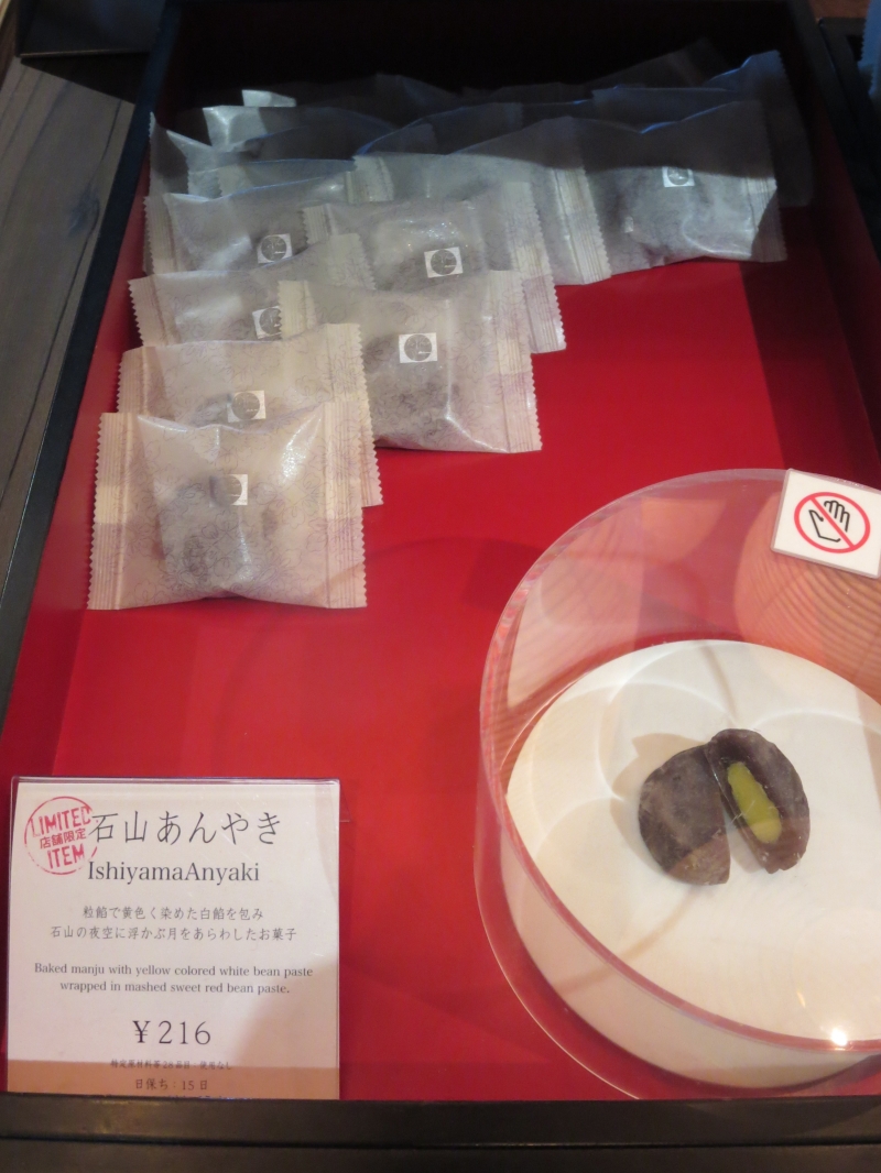 粒餡で黄色く染めた白あんを包み、石山の夜空に浮かぶ月をあらわしたそう。店舗限定です。