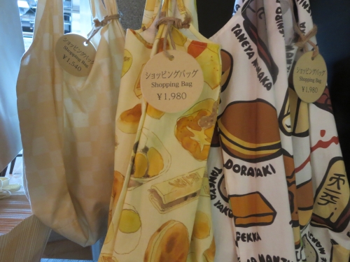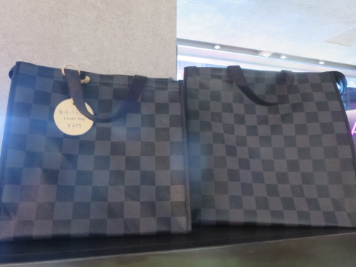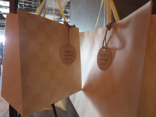 左からSサイズとLサイズの紙袋各110円、ビニール製ショッピングバッグ(左/1,540円、中と右/各1,980円)、保冷バッグ(495円)