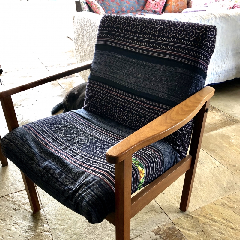 こちらの生地は、古いアームチェアの張り替えに使いました。やはりクッションは、底の部分でネジで固定しているだけなので、クッションに生地を縫い付けて簡単にリメイクする事が出来ます。