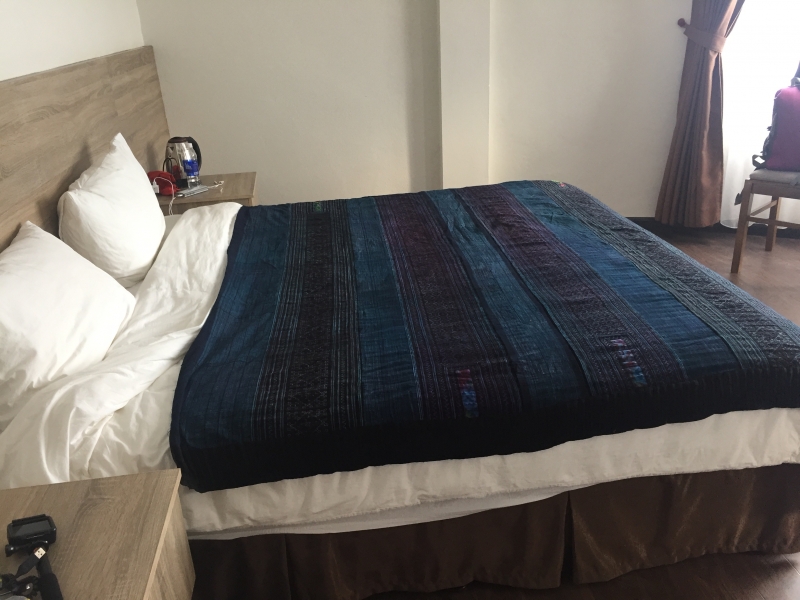 ホテルの部屋で広げてみた戦利品の藍染の生地です。ダブルベッドのカバーに出来そうなくらいの大きなサイズ。