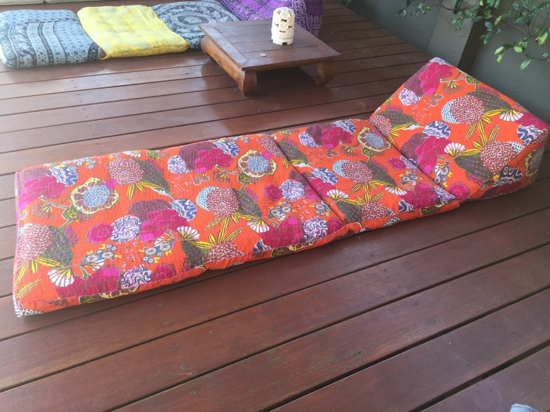 IKEAのソファーにインド布を敷いて、カラフルなクッションを置いただけですが、インドのお洒落カフェのようになりました。