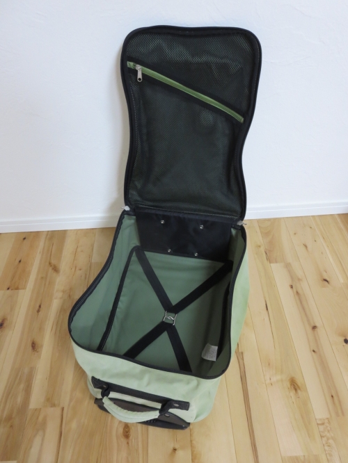 ハードタイプのスーツケースの場合、底面を下にして蓋側を持ち上げて開ける構造になっています。中仕切りは蓋側に付いているので、そうしておくことで蓋側の荷物がガサッと落ちて散乱することを防げます。逆側を開けなように注意してくださいね。