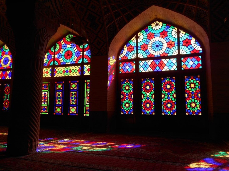 イランにあるマスジェデ・ナスィーロル・モルク。可愛らしいステンドグラスが、太陽の光を受けて反射する光景が美しいですね!