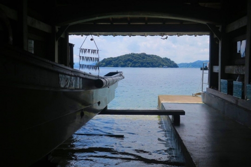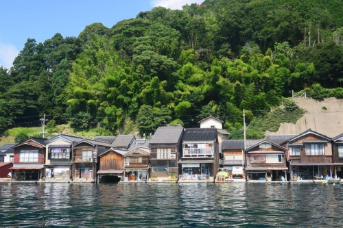 伊根湾に沿って約230軒もの舟屋が並ぶ「伊根の舟屋」。舟屋はぽっかりと1階が穴が開いたようになっており、船のガレージとなっています。中には見学できる舟屋もあり、1階からは絵画のように綺麗に青島を見ることができます。