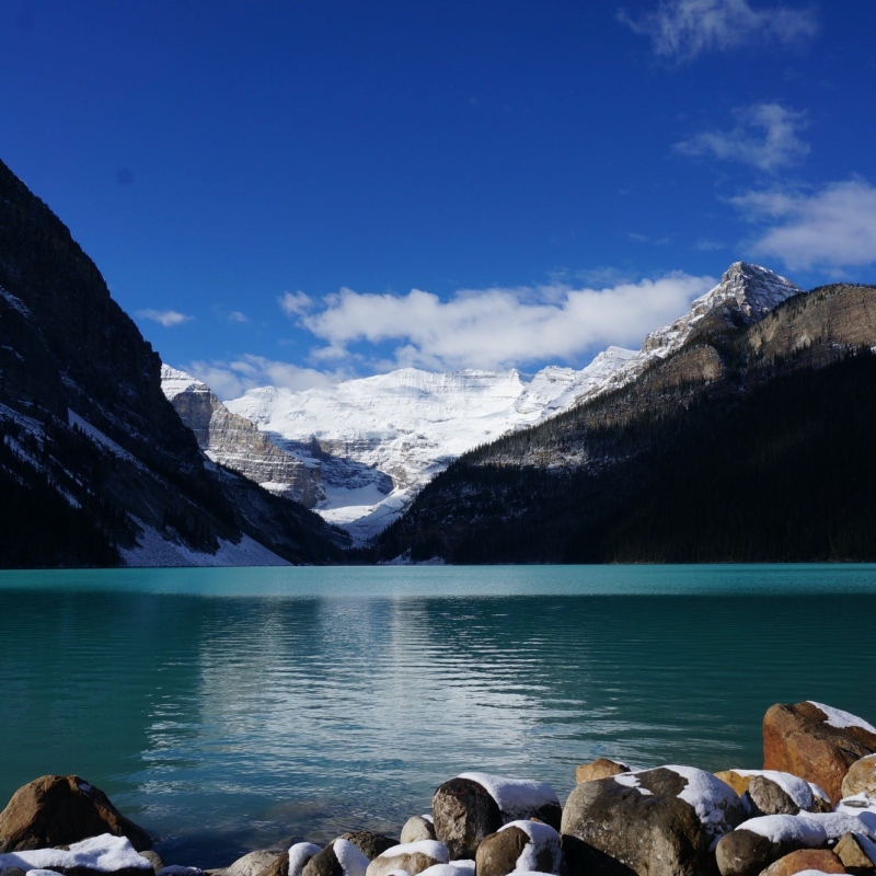 「ロッキーの宝石」と称され、カナディアン・ロッキーで最も美しいと言われる氷河湖「レイク・ルイーズ」。カナダを訪れたなら一度は見たい絶景のひとつです。背後にある3,000m級のマウントビクトリアがまるで鏡のように湖面に映り、神秘的!