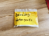 写真:KatieM |  写真:KatieM 一回分の量を小分けにしておくと便利! |  写真:KatieM 空港で荷物検査を受けた際に「洗濯用洗剤」と明記しておくと安心! |