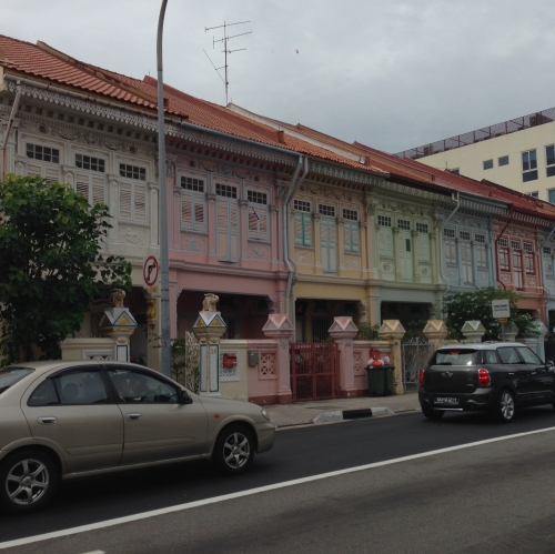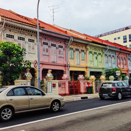 色鮮やかなパステルカラーの可愛い家々が並ぶ、シンガポールのクーンセンロードにて。あいにくの曇り空で、せっかく可愛い家々も暗い雰囲気の写真でしたが、編集により綺麗な色がでました。