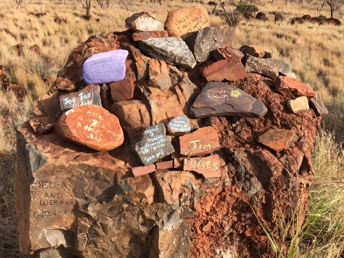 最初に訪れたのは何やらメモリアル的なオブジェが並んでいる所。どうやら亡くなった人を偲ぶ場所らしく、メッセージが書かれた石やボード、たぶんその方々が好きだった物などが積み重なって置いてありました。