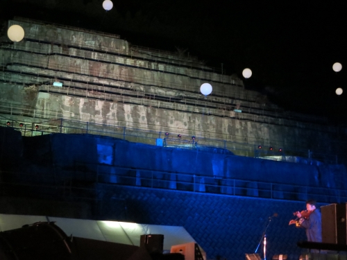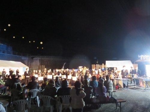 ライトアップ初日は「夜の魅力創出イベント」という点灯式が行われており、多くの人が訪れていました。朝来市長の挨拶、カウントダウンの後に素敵にライトアップされました。山内達哉氏の「燕」「愛の賛歌」など素晴らしい演奏や、朝来市ウィンドアンサンブルの演奏が山々にこだまして迫力を増し、心に響きました。