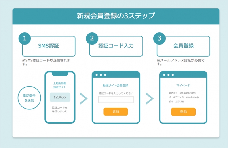 パンダ母子観覧の抽選に応募するには、ジャイアントパンダ母子観覧抽選サイトへの会員登録が必要です。SMS認証と、メールアドレス認証の二段階認証を行います。