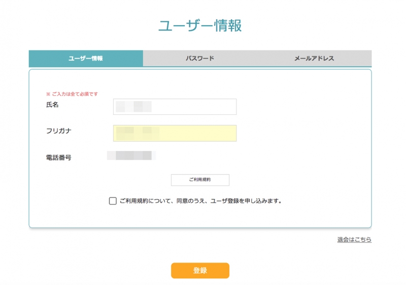 ⑤ユーザー情報を入れます。すべて入力して、「ご利用規約」を読んだ後、「ユーザー登録を申し込みます」にチェックをいれ、登録ボタンを押して完了です。