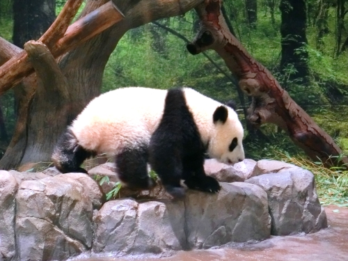 お母さんパンダの「シンシン」は、「レイレイ」と一緒に室内展示場を歩きまわっていました。